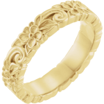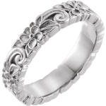 “Leilani,” meaning heavenly flower, captures the essence of this fully engraved floral design that wraps seamlessly around the entire band. Each petal and flowing detail creates a continuous pattern, giving the ring a sense of movement and softness from every angle.