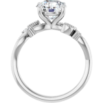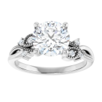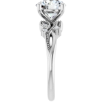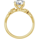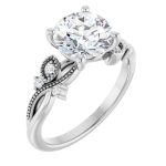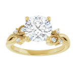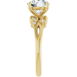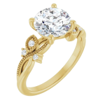 The Marigold ring showcases the center stone of your choosing in a classic solitaire setting, secured in refined prongs that highlight its natural brilliance. The band is adorned with delicate floral-inspired detailing, featuring soft curves, milgrain accents, and subtle diamonds that add texture and romantic movement. Feminine and timeless, Marigold is designed to frame your chosen stone with intricate, nature-inspired beauty.