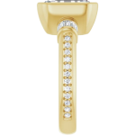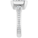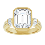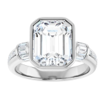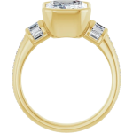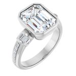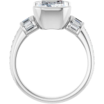 The Monroe ring design features your chosen center stone set in a sculpted bezel setting, offering a bold, modern take on a classic silhouette. East-west baguette side stones on a 3mm band add a structured, elevated contrast, while a delicate pavé band softens the look with subtle brilliance. Striking yet balanced, this piece blends strong architectural lines with refined detail for a look that feels both contemporary and timeless.