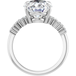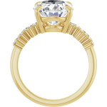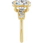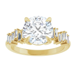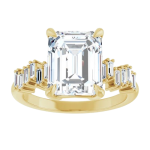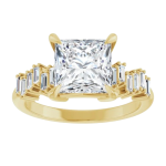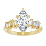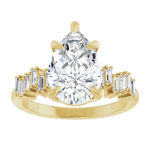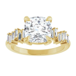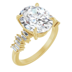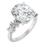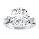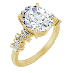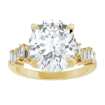 The Stella ring features your chosen oval center stone set in a classic basket setting, accented by baguette diamonds along the band that create a striking, structured contrast. The clean lines of the baguettes enhance the brilliance of the center stone while adding a bold, architectural edge to the overall design. Balanced and refined, Stella blends timeless elegance with modern detail for a look that feels both elevated and distinctive.